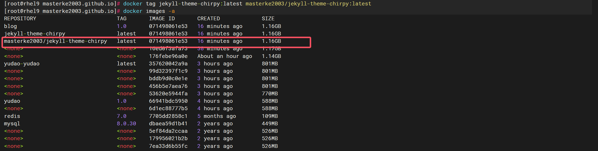 使用docker tag jekyll-theme-chirpy:latest masterke2003/jekyll-theme-chirpy:latest为这个镜像取一个别名然后推送到dockerhub上去: