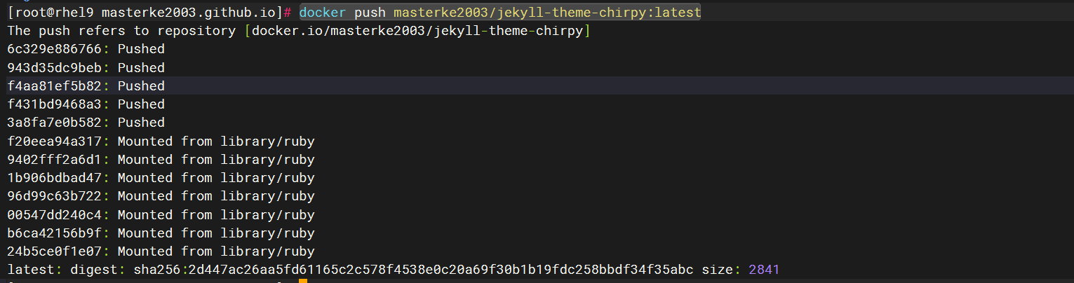 使用docker push masterke2003/jekyll-theme-chirpy:latest将镜像推送到dockerhub上: